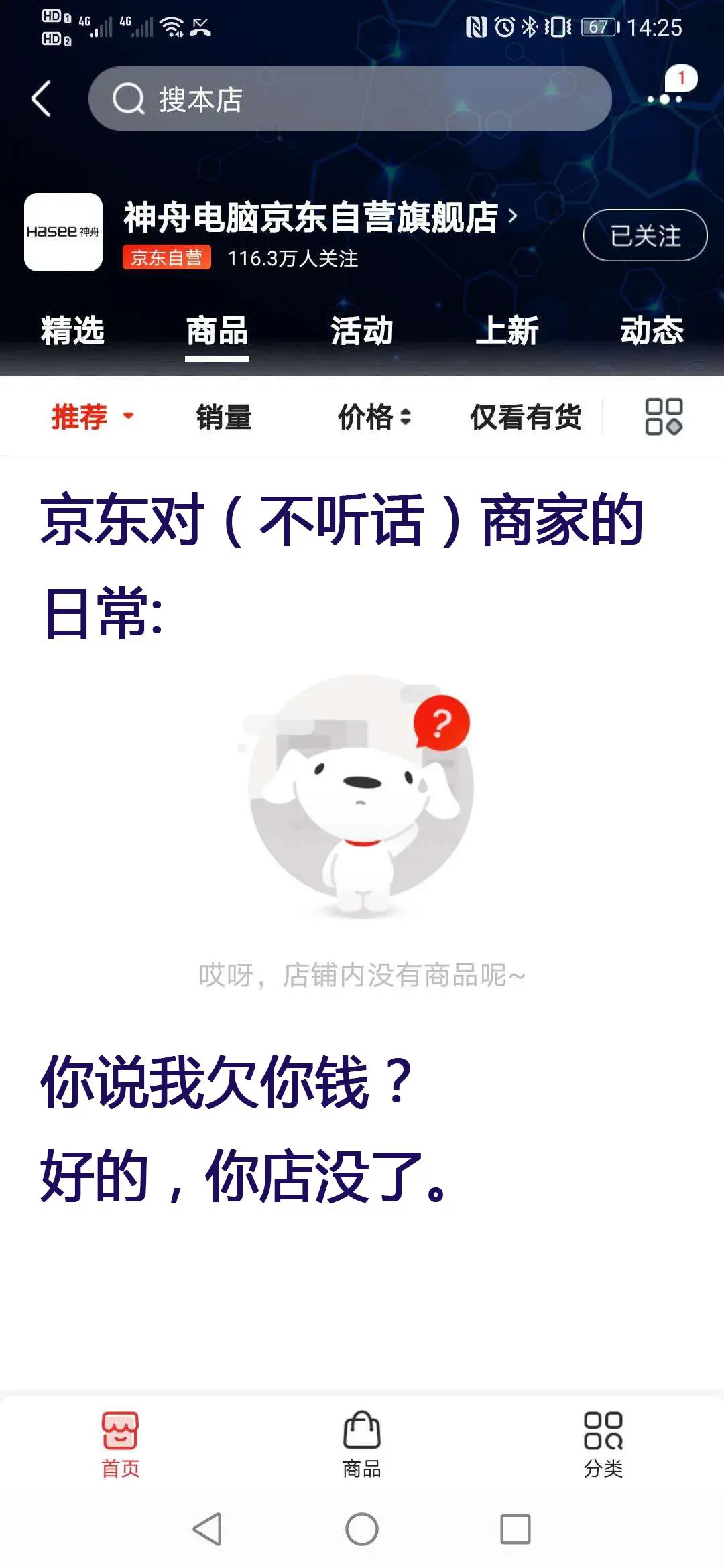 截止发稿前,打开神舟电脑的京东自营旗舰店,其商品已全数下架了,吻合了京东此前威胁神舟的“不然就清盘”,也印证了京东对不听话商家的“日常”。