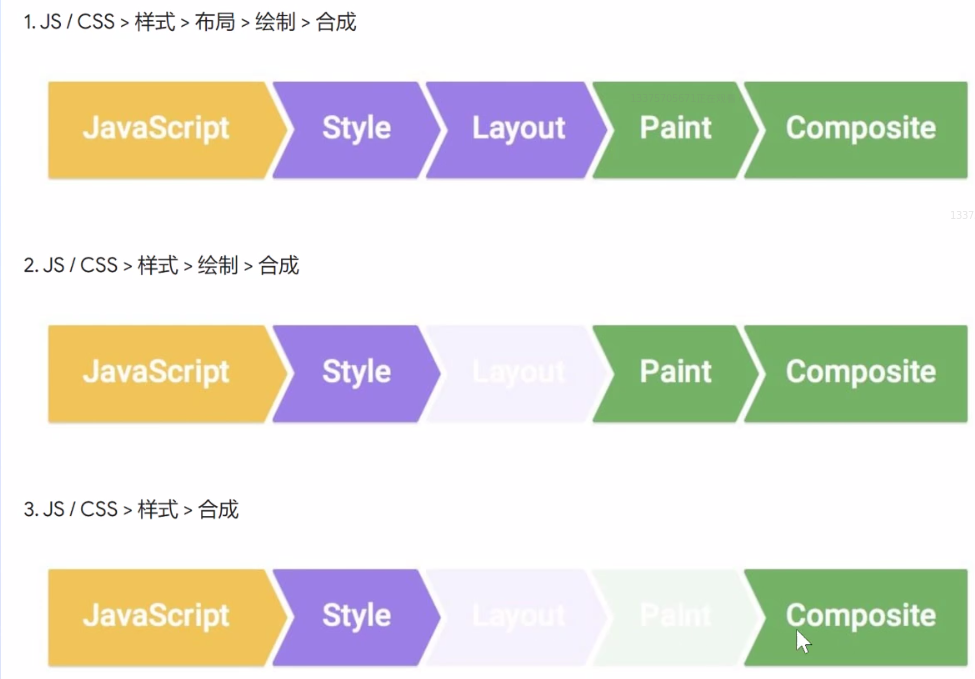当我们使用js的时候,网页的显示内容会发生改变,这时候发生了什么呢,其实就是浏览器重新渲染的过程,但是浏览器也不傻,他会选最省资源的方式去更新样式,所以就有了3种样式更新的路径