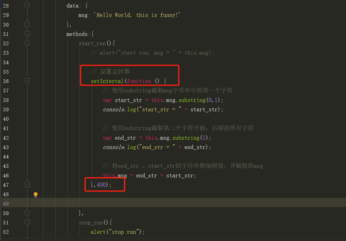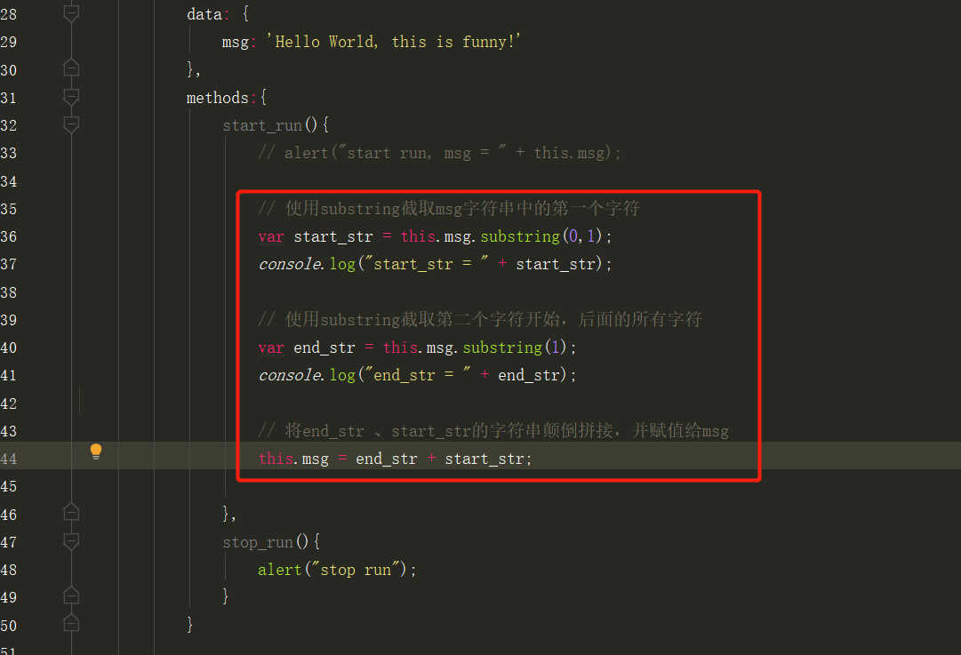 start_run()方法首先需要获取当前显示的字符串Hello world, this is funny,然后使用substring(开始截取的字符位置, 停止截取的字符位置)截取字符串,将第一个字符拼接到最后去。 -