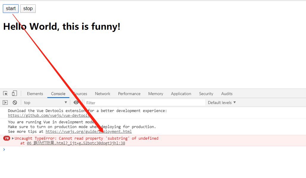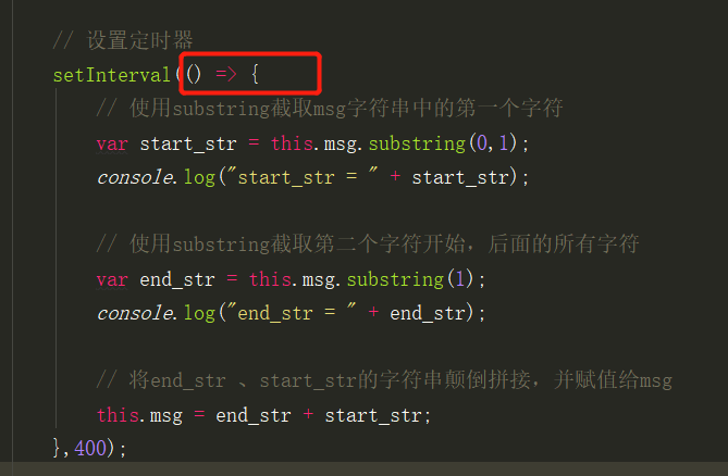 在这里提示substring方法未定义,其实这是一个this指针的问题。因为当将截取字符串的操作方法放入定时器的function()中,那么此时this指针则是指向function,而function()并没有定时msg,由于找不到msg,进而提示找不到substring方法。