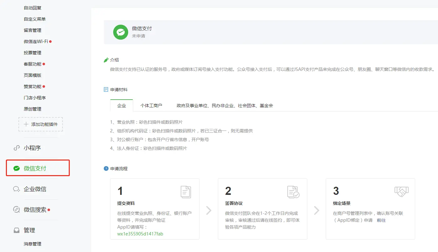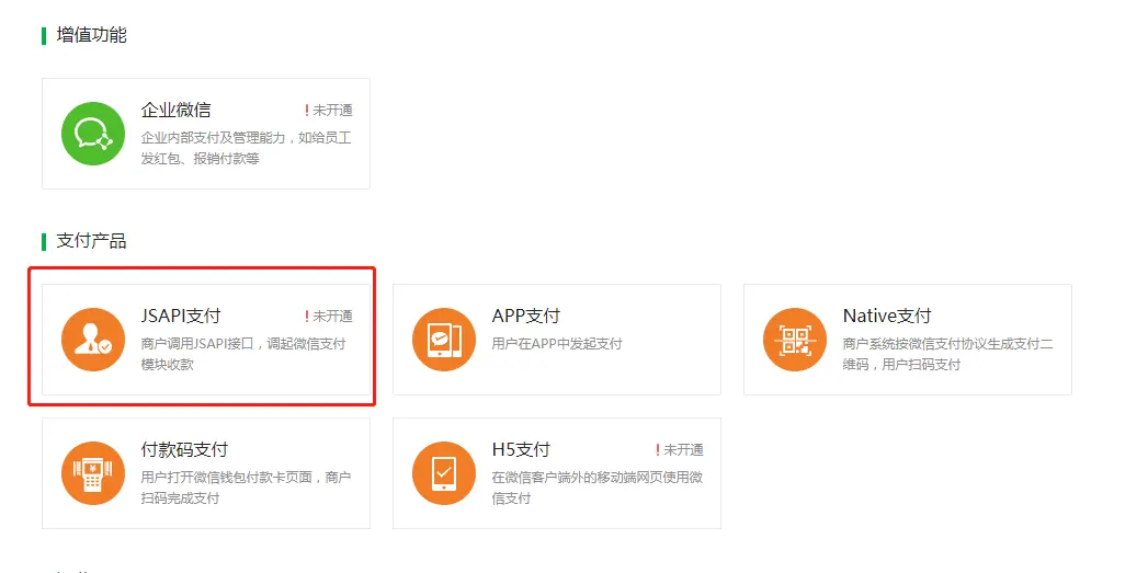 如果是从服务号申请的商户号,默认就开通了JSAPI支付,否则需要从产品中心->JSAPI提交申请