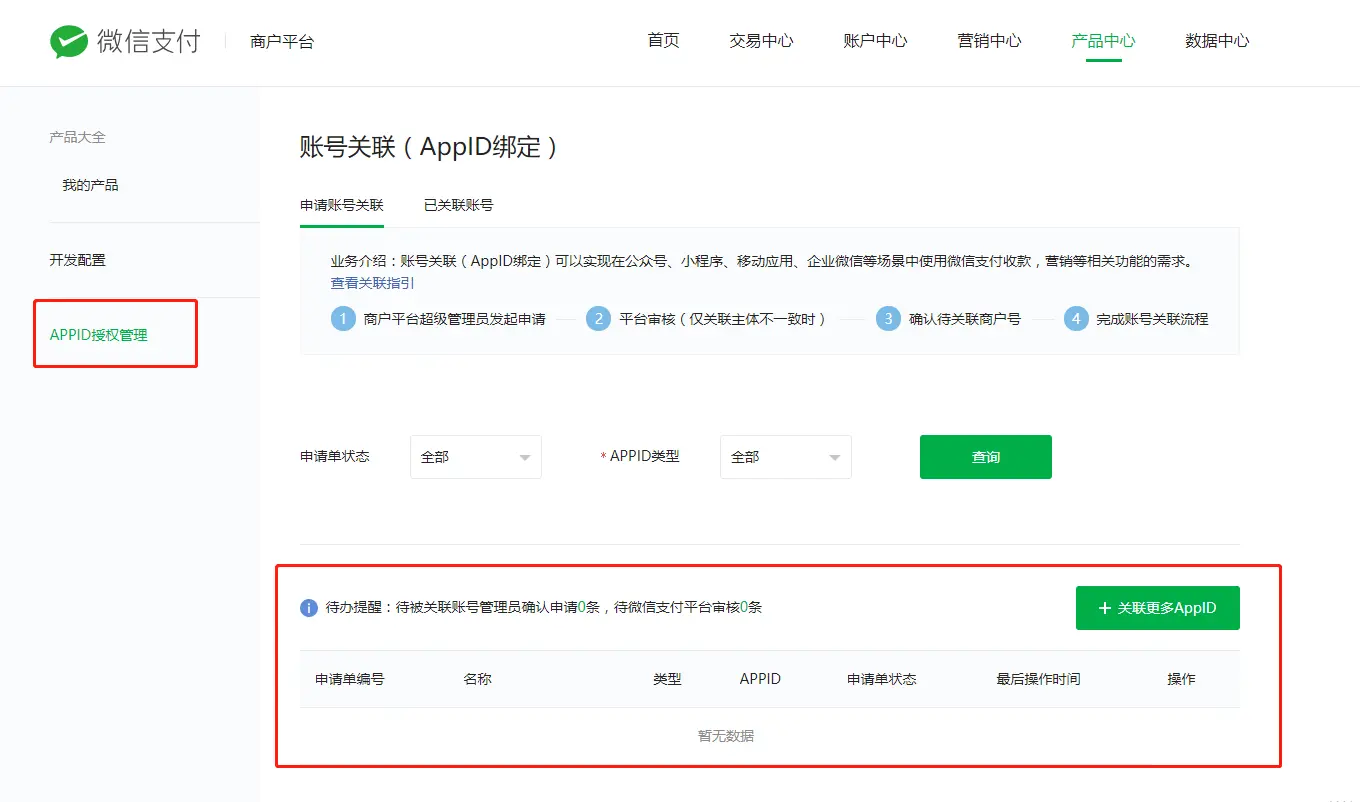 如果还未绑定,需要提交绑定申请,并到服务号进行确认(如果服务号和商户号的经营主体不一致,则需要经过审核)