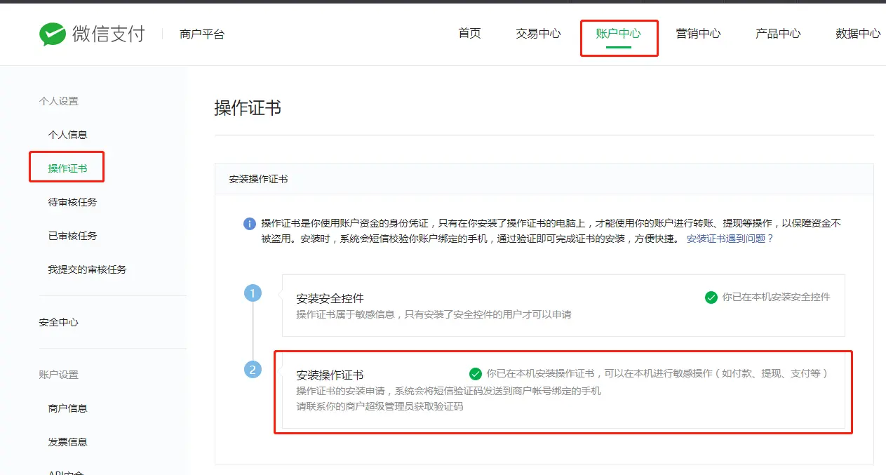 设置API密钥需要安装操作证书,如果前面操作中已经安装过,则可以无需再安装