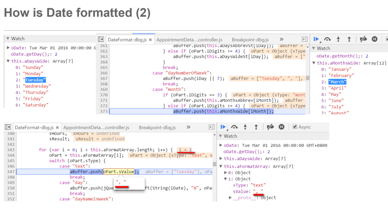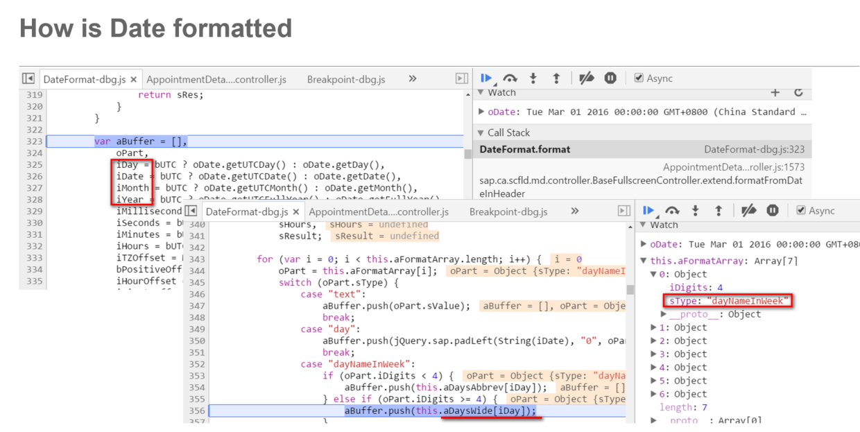 SAP Fiori应用里日期格式的显示奥秘 已注销 2020-02-25 142 阅读1分钟 下图这个Fiori应用里的日期显示,Tuesday, March 1,2016,从后台返回的值为/Date(1456803000000)/ 那么前台显示的可读性较好的日期是如何转成而成的? 奥秘就在Jerry这些单步调试的代码截图里: 要获取更多Jerry的原创文章,请关注公众号"汪子熙":