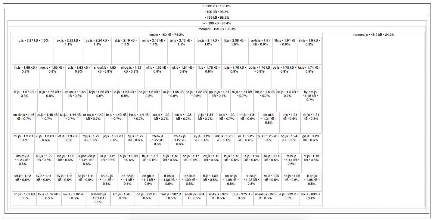针对这一条,有一个典型的例子是以体积过大而臭名昭著的 moment.js 模块,它仅仅用于 DateTime 的格式化及各种计算。但你 import 之后它的体积竟然达到了 200kb+,gzip 后仍然有 69kb。以至于在 github 上有一个仓库专门用来介绍如何优化它,