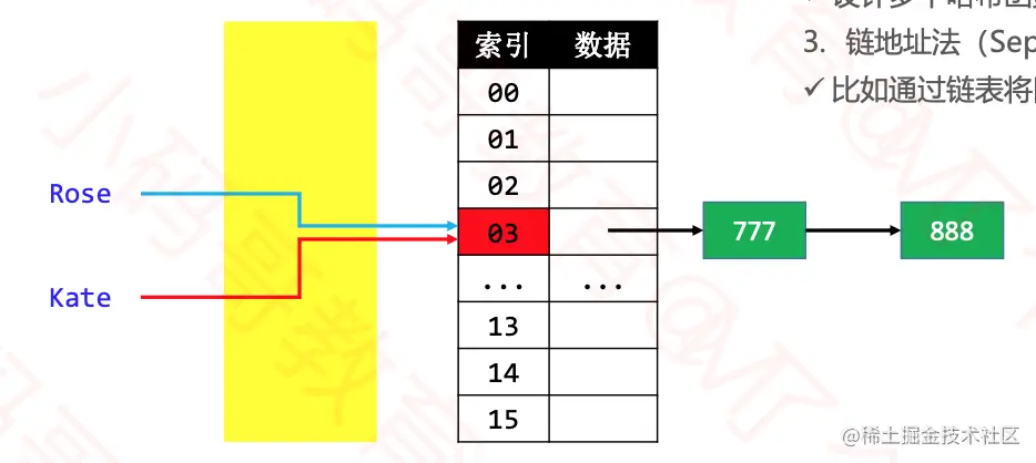 再哈希法) - 通过链表将同一index的元素串起来。(