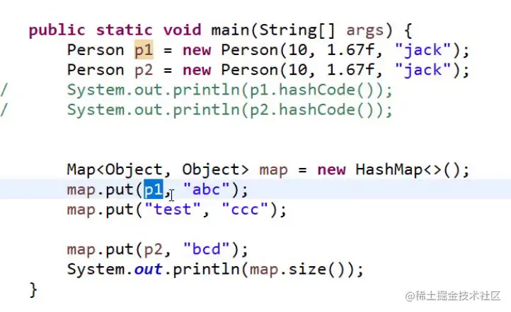 p2时,会调用equals函数比较p1和p2,因为重写了equals函数,所以会返回true,在map中,当确认两个对象相等时,则会执行替换: