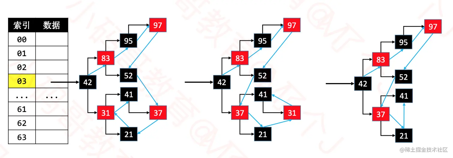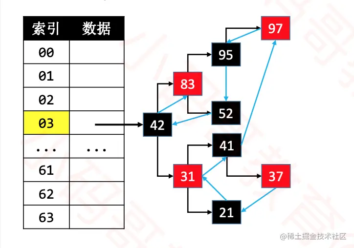 key(索引)。 key对应的value(数据)则直接保存红黑树的根节点。