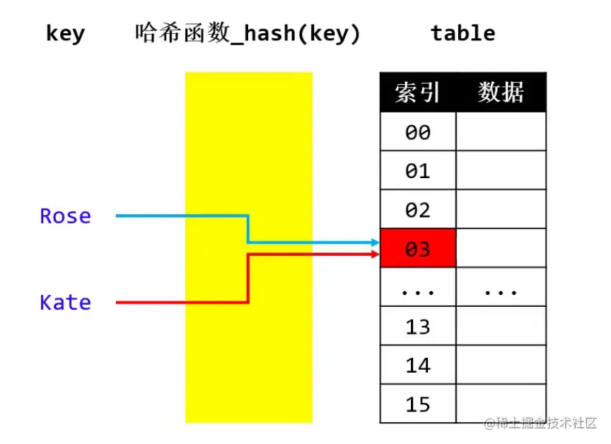 key,经过哈希函数计算出相同的结果。 key1 != key2,hash(key1) = hash(key2)
