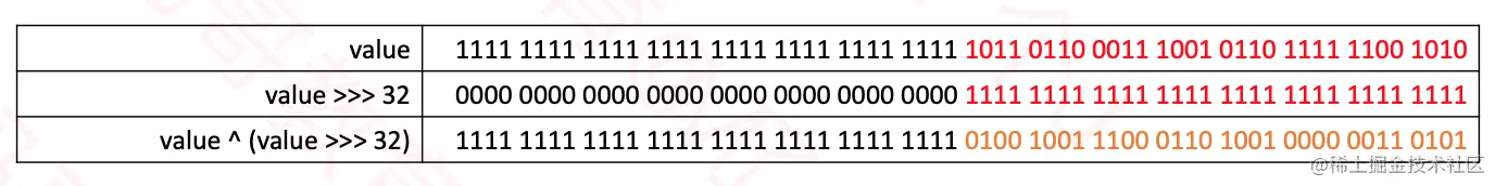 java中的hash值必须是整数,即是32位。Long和Double都是64位,可以将value的高32位和低32位混合计算出32位的值,然后再用value的值与这个32位值做亦或运算(相同为0,不同为1)。亦或运算之后再将64位的结果强制转换为32位。- 最终获取的值是