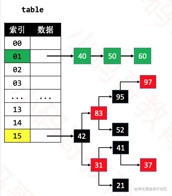 单向链表的节点数量大于8时,将转为红黑树来存储元素。在调整容量时,如果树节点数量小于6,又会转为单向链表。 - 为什么不使用