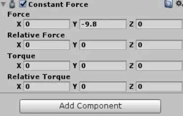 加组件Constant Force,设置y方向的力,负值为向下