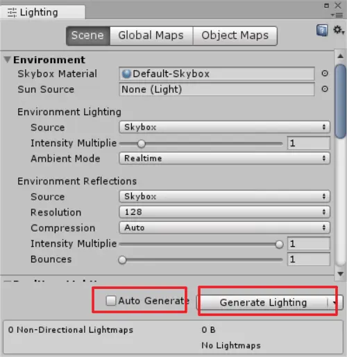 点击 菜单栏>Windows>Lighting>Settings,取消自动渲染,再点击右侧按钮,会发现在场景文件夹下新生成了保存场景光照信息的文件夹