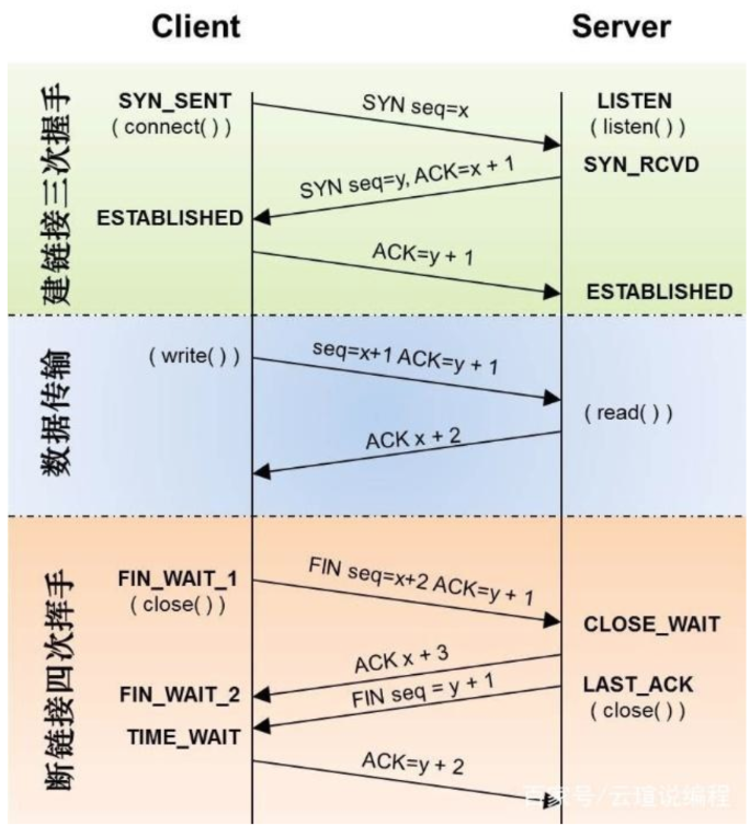 (seq序号 -- sequence, ack确认号 -- acknowledge): 客户度发送:seq=x 服务端发送:seq=y,ack=x+1 客户端发送:ack=y+1