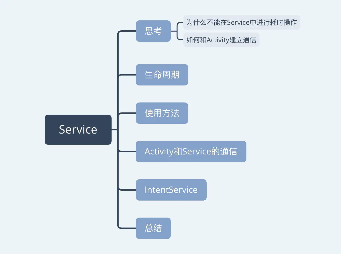 Service的响应时长不能超过20s,其实也可以比较直观的看出,Service其实并不能进行所谓耗时操作。但是如果加上了Thread进行异步处理,那么其实他还是可以进行耗时操作的。(具体看你怎么进行回答,主要还是一个知识点,Service运行在主线程) Service存在的原因是Activity是一个经常会被销毁的组件,虽然我们同样可以通过Thread进行异步操作,但是当Activity实例被销毁时,相应的捆绑在Activity生命周期内的Thread实例我们也没有能力再去寻找了。