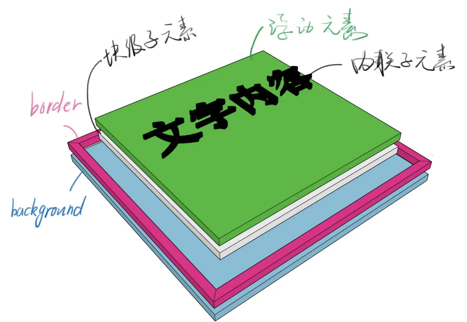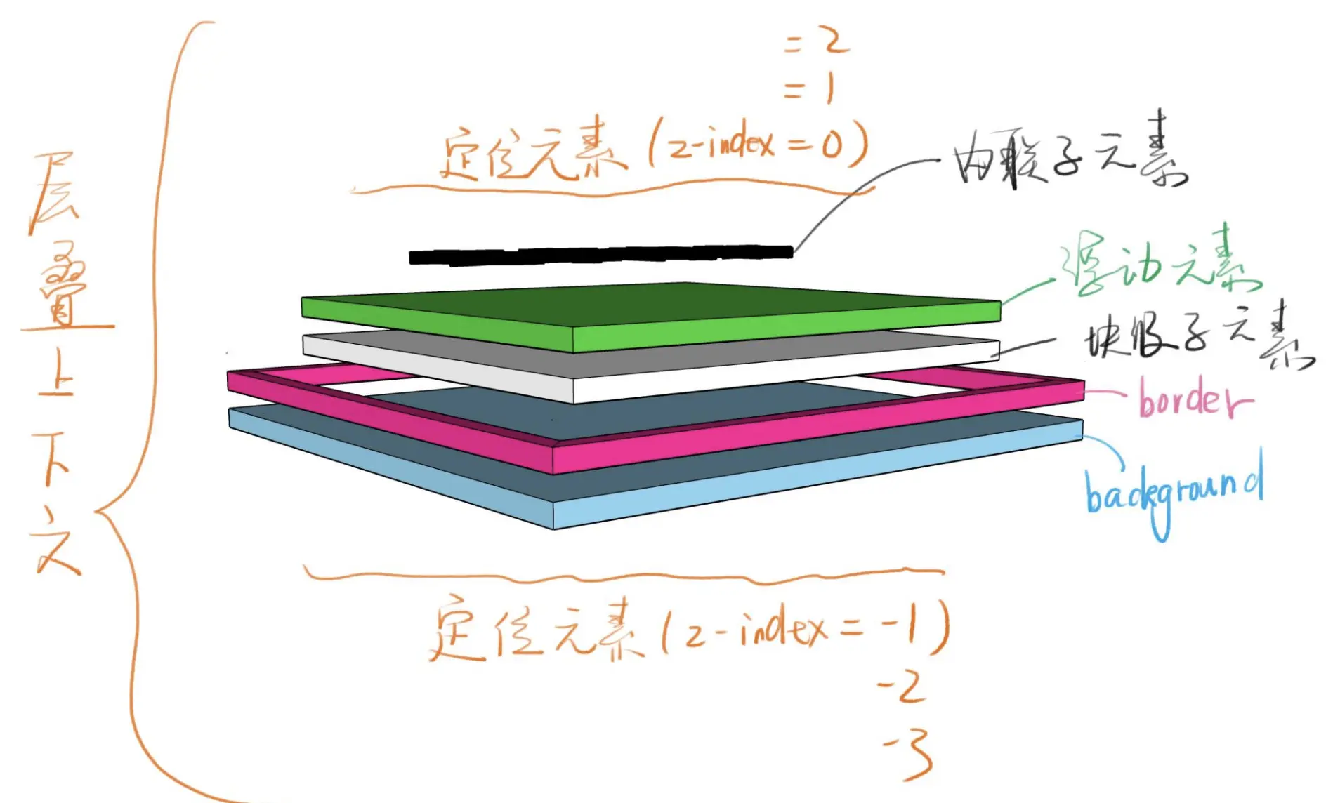 由上到下分为: 内联子元素(文字)> 浮动元素 > 块级子元素 > border > background-color