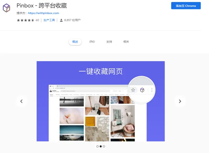 安装 Pinbox 扩展后,右键即可一键收藏,在chrome扩展中心 pinbox 的评分高达4.7分,可见用户对 pinbox 的喜爱