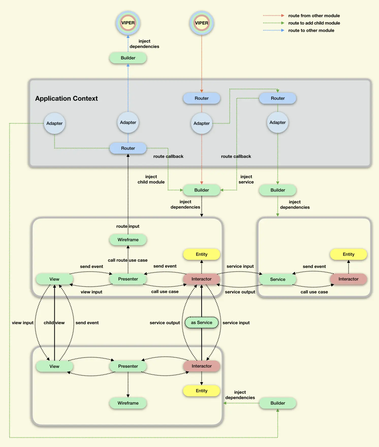 - 交互器 -- 包括关于数据和网络请求的业务逻辑,例如创建一个实体(数据),或者从服务器中获取一些数据。为了实现这些功能,需要使用服务、管理器,但是他们并不被认为是 VIPER 架构内的模块,而是外部依赖。