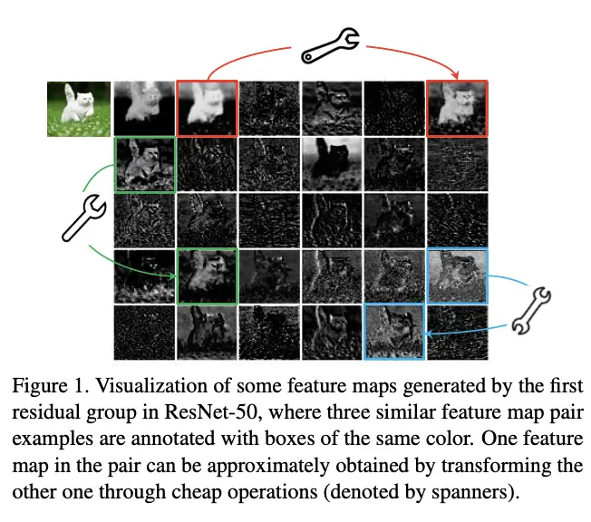 训练好的网络一般都有丰富甚至冗余的特征图信息来保证对输入的理解,如图1 ResNet-50的特征图,相似的特征图类似于对方的ghost。冗余的特征是网络的关键特性,论文认为与其避免冗余特征,不如以一种cost-efficient的方式接受,获得很不错的性能提升,论文主要有两个贡献: