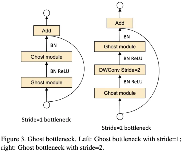 Ghost Bottleneck(G-bneck)与residual block类似,主要由两个Ghost模块堆叠二次,第一个模块用于增加特征维度,增大的比例称为***expansion ration***,而第二个模块则用于减少特征维度,使其与shortcut一致。G-bneck包含stride=1和stride=2版本,对于stride=2,shortcut路径使用下采样层,并在Ghost模块中间插入stride=2的depthwise卷积。为了加速,Ghost模块的原始卷积均采用pointwise卷积