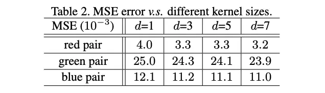 论文对图1的ghost pair进行了不同核大小的线性变化测试,将左图作为输出右图作为输入训练depthwise卷积,然后使用训练的结果对左图进行变换,计算其变换后与右图的MSE。可以看到,不同的核大小下差值都很小,说明线性变换是有效的,而且核大小的影响不大,所以用核固定为d的depthwise卷积来进行公式3计算