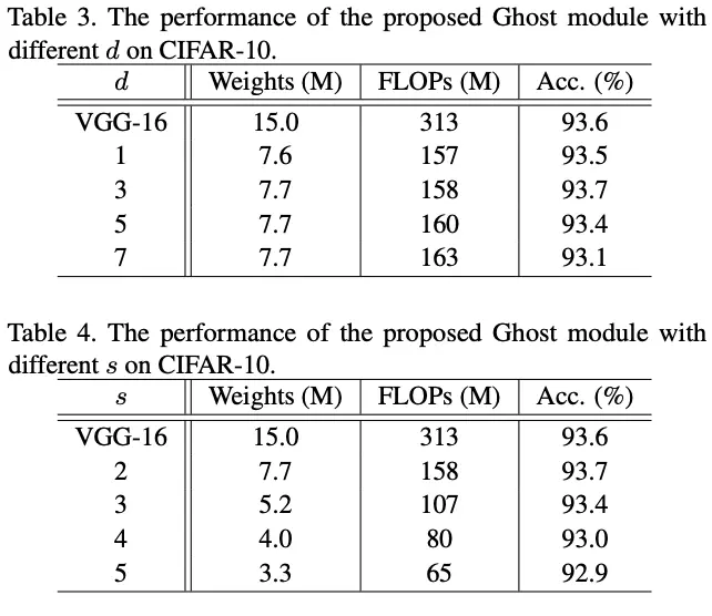 将VGG的卷积层替换成Ghost模块进行超参数测试,表3的,表4的