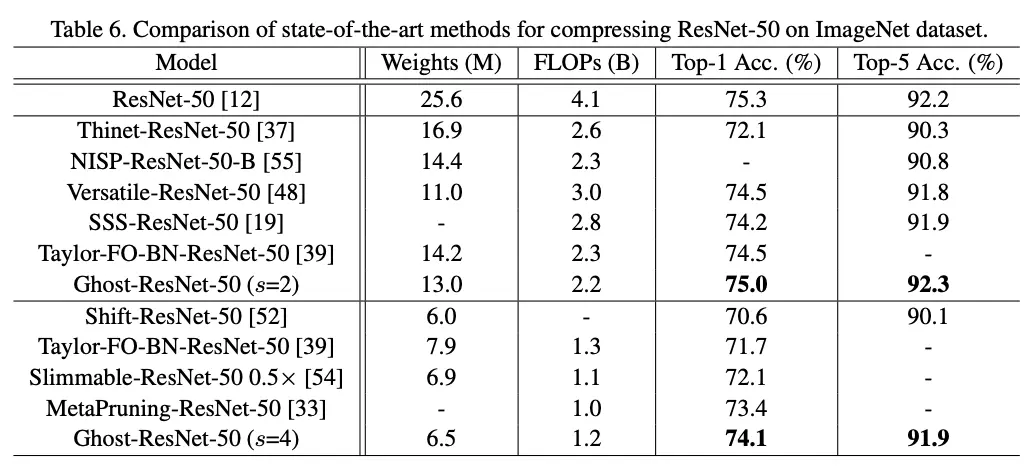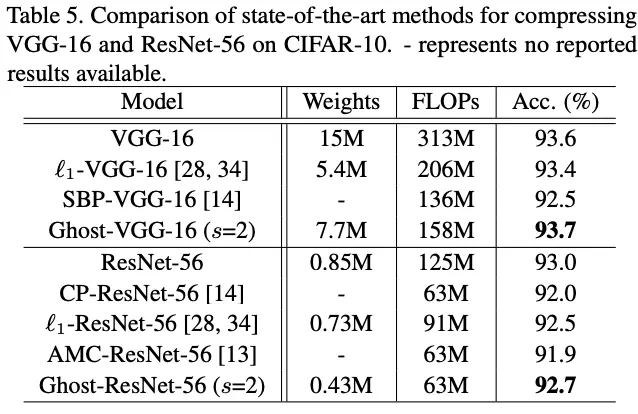 可以看到使用Ghost模块不仅比其它压缩方法更能降低模型的体量,也最能保持模型准确率