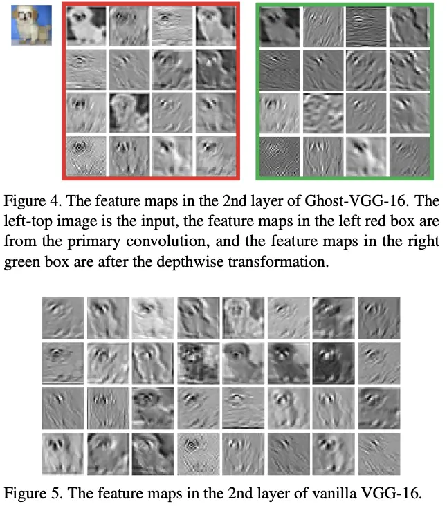 对Ghost模块产生的特征进行了可视化,尽管从内在特征线性变换而来,但还是有明显的差异,说明线性变换足够灵活