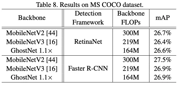 在one-stage和two-stage检测算法上,GhostNet能降低大部分计算量,而mAP与其它主干网络差不多