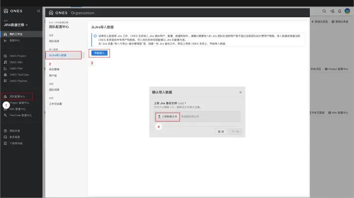 管理员在ONES 主菜单 > 团队配置中心 > 从Jira导入数据 > 开始导入 > 上传数据文件,此过程将会持续 30 分钟左右,在完成导入后将会邮件形式通知管理员。