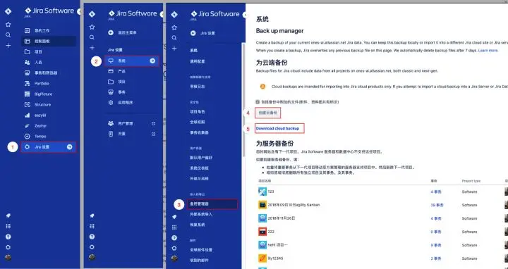 在 Jira 左边栏主菜单 > Jira Settings (设置) > System (系统) > Backup manager (备用管理器) > Creat backup for cloud (创建云备份) > Download cloud backup (下载云备份)