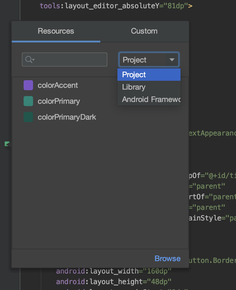 在此版本中,我们希望更轻松地应用已定义为颜色资源的颜色。在 Android Studio 3.6 中,颜色选取器将填充应用中的颜色资源,以便快速选择和替换颜色资源值。颜色选取器可在设计工具和 XML 编辑器中访问。