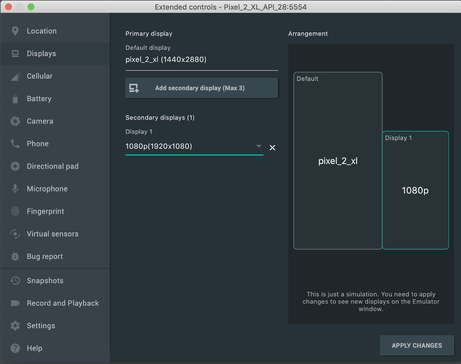 模拟器 29.1.10 包括对多个虚拟显示器的初步支持。由于有更多的设备具有多个显示器,因此在各种多显示器配置上测试应用非常重要。用户可以通过设置菜单(扩展控件和设置)配置多个显示器。