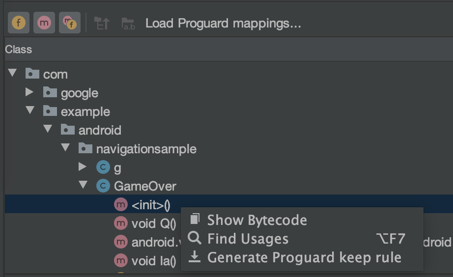 使用 APK 分析器检查 DEX 文件时,现在可以取消分类和方法字节码。在 DEX 文件查看器中,加载要分析的 APK 的 ProGuard 映射文件。加载后,您将能够通过选择"显示字节码"右键单击要检查的类或方法。