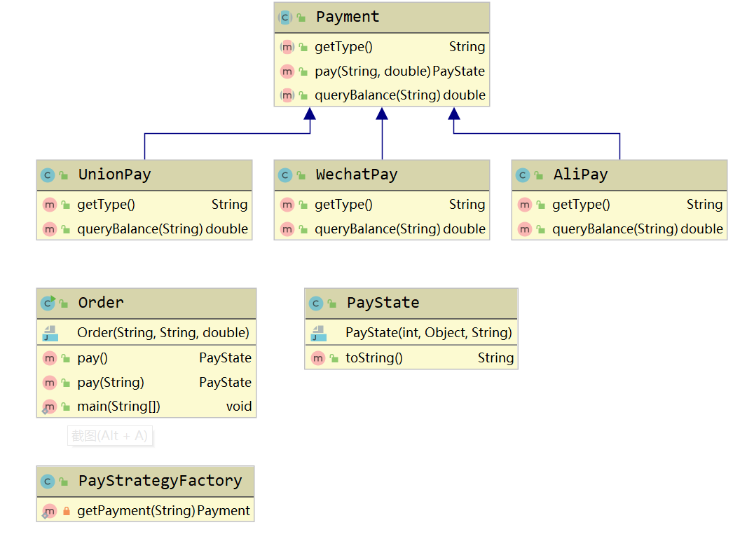 为了加深大家对策略模式的理解,结合实际生活场景再举一个例子。大家都用过移动支付进行付款,比较流行的支付方式有支付宝、微信、银联等。一个场景的支付场景就是在支付的时候提示会选择支付方式,如果用户没有进行选择,那么系统会使用默认的支付方式进行结算。