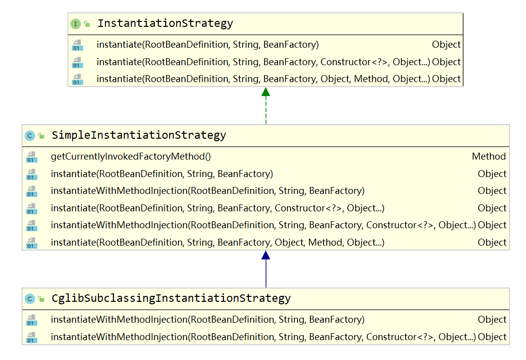 顶层的策略抽象非常简单,但是它下面有两种策略 SimpleInstantiationStrategy 和CglibSubclassingInstantiationStrategy,我们看一下类图: