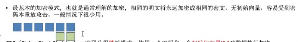 - ECB(Electronic Code Book):电子密码本模式。每一块数据独立加密;