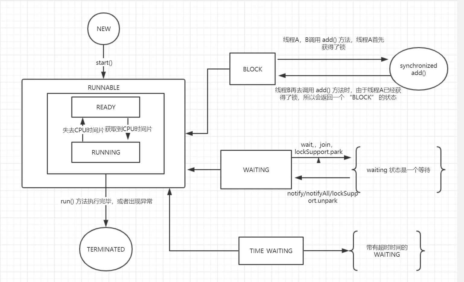 - BLOCK:当我们有两个 a,b 去调用 synchronized add() 方法时,若 a 先获得锁,b 在去获得锁时,便会返回 BLOCK 状态