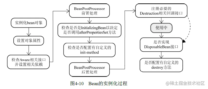 通过Spring容器依次在实例化Bean的过程中调用InstantiationAwareBeanPostProcessor接口的四个方法postProcessBeforeInstantiation()、postProcessAfterInstantiation()、postProcessProperties() / postProcessPropertyValues(),将Bean的实例化分成了四个阶段-开始实例化前、通过策略模式选择对应的构造器通过反射去实例化对象、完成实例化后、依赖对象注入;