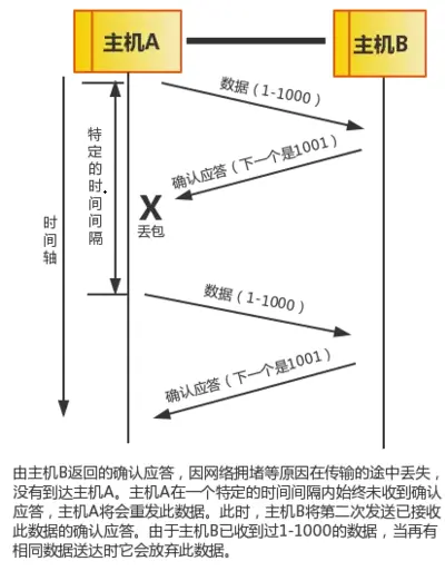 这个图中主机A的数据正常发送到主机B,但由于网络堵塞等原因,主机B的ACK没有达到主机A。主机A在一定时间间隔内始终没收到ACK,则会重发这个数据。 此时,主机B收到数据后就会再次发送ACK,但是由于主机B已经接收过1-1000的数据,所以当再有相同数据达到它时就会放弃这个数据。