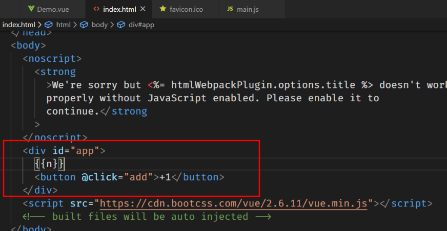 - Vue 完整版的实例 我们可以把页面的视图代码直接用 html 标签写出来,这样视图就直接渲染到页面上了,而不是写在 js 中。 如图:
