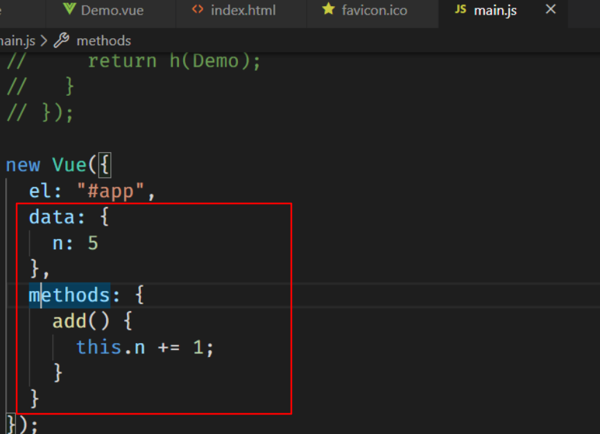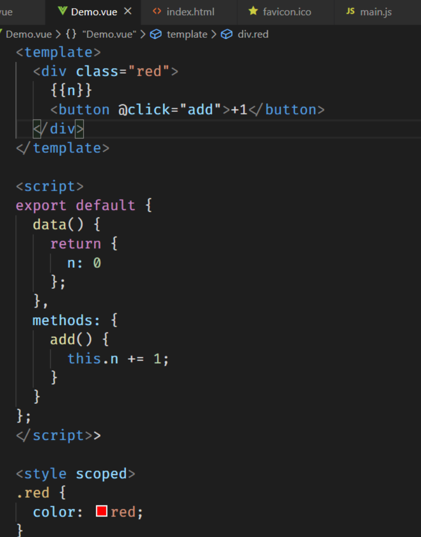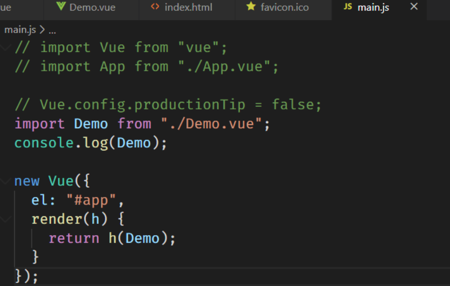 上述代码写在 Demo-vue 文件中网页其实是看不到任何东西的,但是最终网页得看的到才行,那就需要到 js 中引入,然后写在 render 函数里,用变量 h 来创建标签,这样才能把视图渲染到页面上。当然这个过程用到了 webpack 中的 vue-loader 加载器。代码如图 如图: