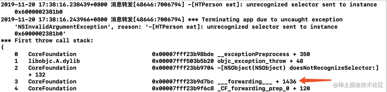 我们知道,如果调用一个没有实现的方法,并且没有进行“动态方法解析”和“消息转发”处理,会报经典的 crash:unrecognized selector sent to instance/class。我们查看 crash 打印信息的函数调用栈,如下,可以看的系统调用了一个叫___forwarding___的函数。