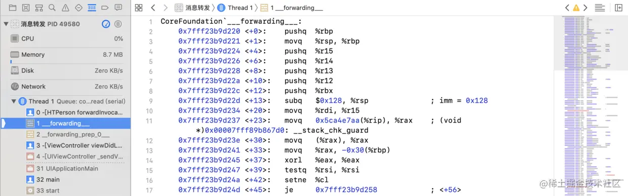 该函数是 CoreFoundation 框架中的,苹果对此函数尚未开源,我们可以打断点进入该函数的汇编实现。