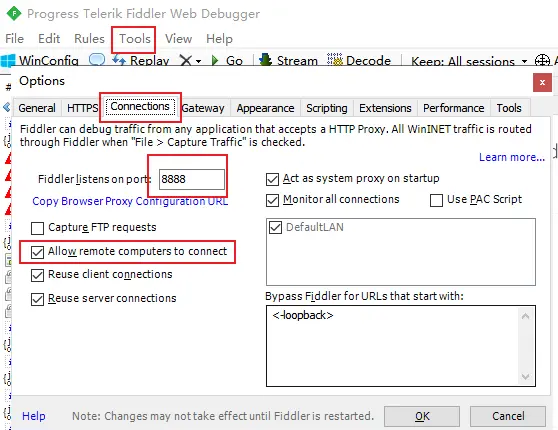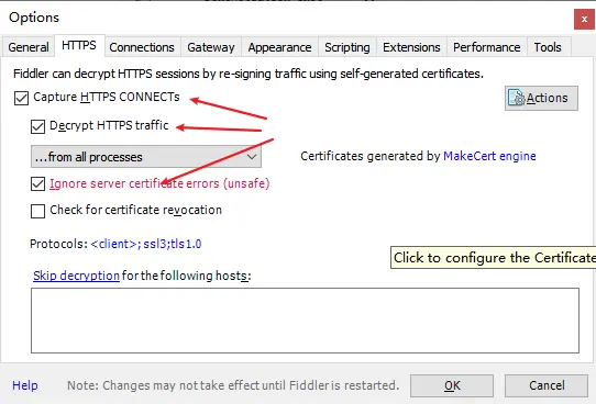 打开fiddler>Tools>Fiddler Options>HTTPS>...from remote clients only,勾选这个选项就可以了