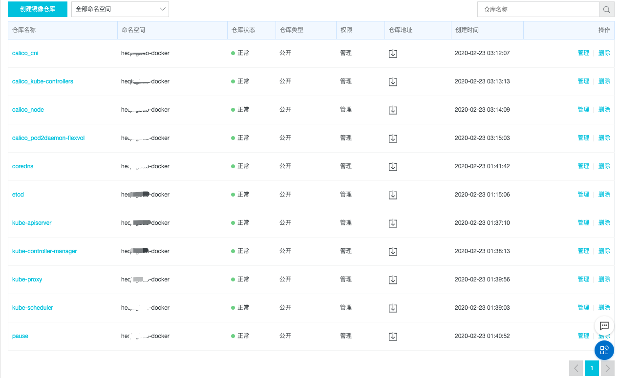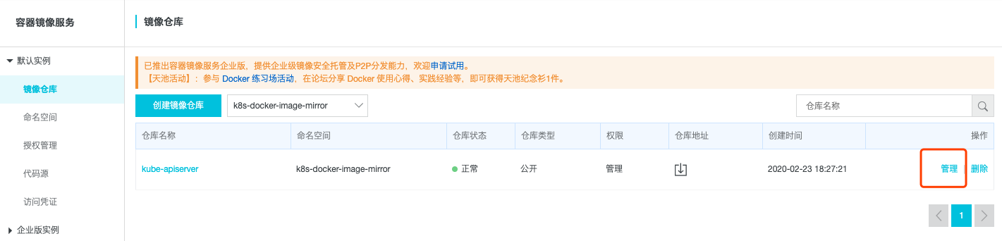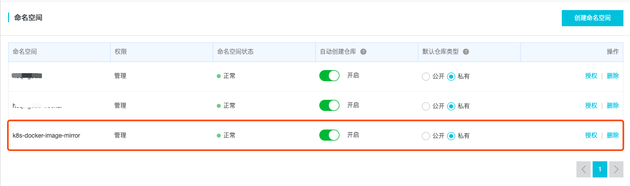 创建一个命名空间,"默认仓库类型" 公有 或 私有 都可以。我这里是 私有。 比如我这里就叫 k8s-docker-image-mirror,如图:
