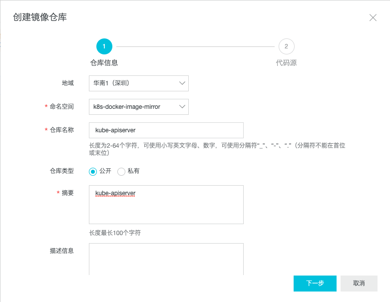 创建一个镜像仓库,地域选择离自己近的,命名空间选择上面创建的 k8s-docker-image-mirror,仓库名称为 kube-apiserver,仓库类型任意(我这选择公开),如图: