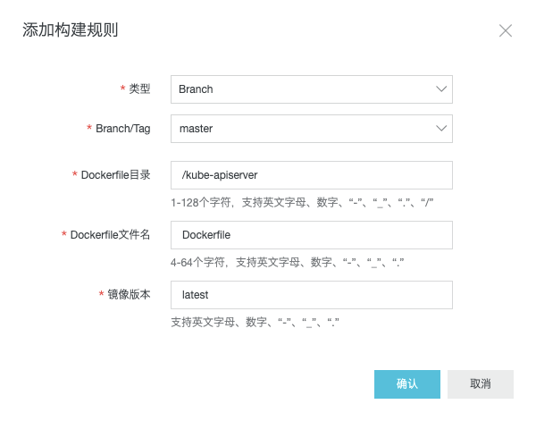 这一步是配置构建规则,比如分支名、Dockerfile 路径等信息,如图: