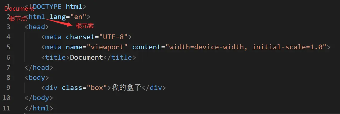 Document:DOM树的根节点,是其他所有节点的父节点,该节点并不是根元素,在html文档中,<html>是根元素,它是Document的子元素。