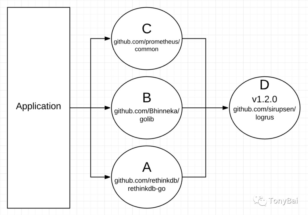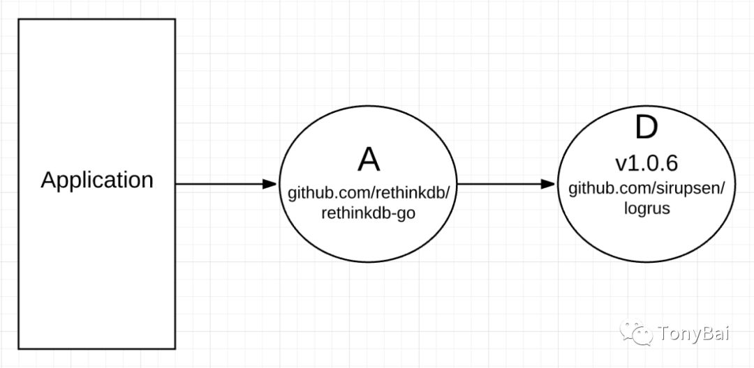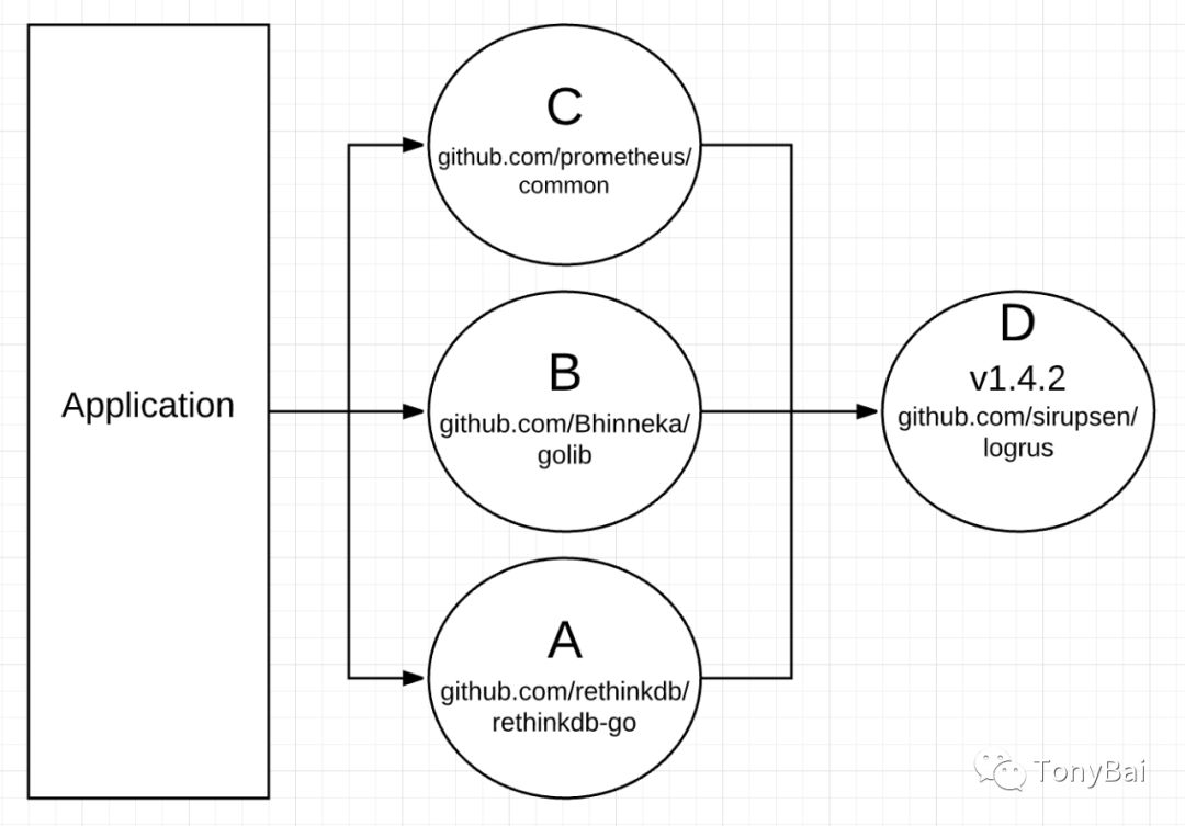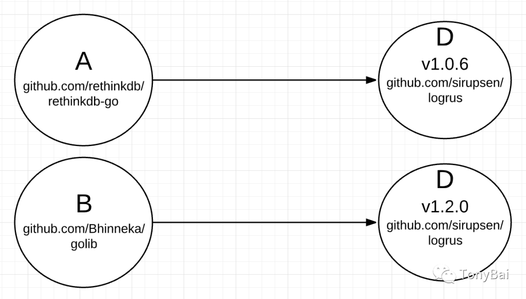 有了上述基础,我将用一个示例项目让你看到Go和MVS算法实际是如何工作的。在此项目中,module D将用logrus module代表,而该项目将直接依赖于rethinkdb-go(moduleA)和golib(moduleB)module。rethinkdb-go和golib module直接依赖logrus module,并且每个module都需要一个不同的logrus版本,并且这些版本都不是logrus的“最新”版本。